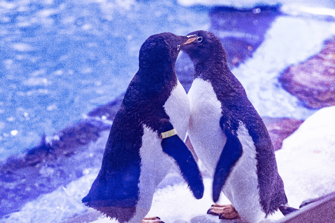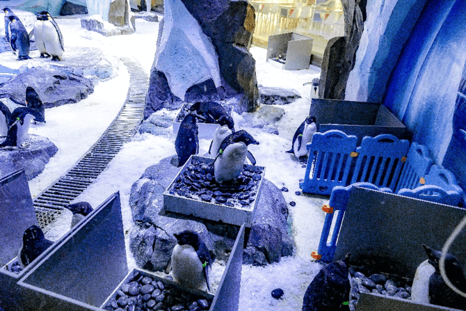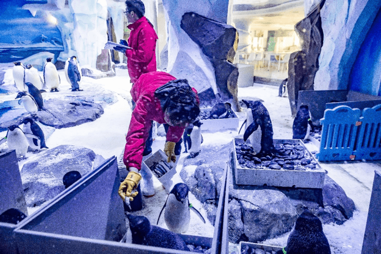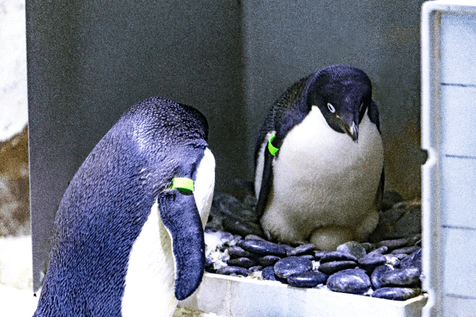 阿德利企鹅在企鹅家族中属于中、小型种类,成年企鹅身高约50厘米,体重在3到5公斤左右,身上色彩仅有黑白配色,非常好辨识。每年的10月到次年2月是阿德利企鹅的繁育期,雌企鹅每次产2枚蛋,并由雌、雄企鹅轮流进行孵化,孵化期一般是1-2月左右。2018年10月,20余只由海昌海洋公园自主繁育的阿德利企鹅在上海海昌海洋公园安家,同时在保育员精心照顾下,它们仅用一年的时间便适应了目前的生活环境。2019年9月开始保育员观察到阿德利企鹅出现“踩背”的交配行为,并发现雄企鹅开始用石头筑巢吸引雌企鹅,于是保育员为企鹅准爸爸准妈妈们打造专门的“企鹅产房”,为它们提供一个更舒适、更安全的待产环境。经历了近一个月的精心照顾,阿德利企鹅在11月陆续产下数枚企鹅蛋。