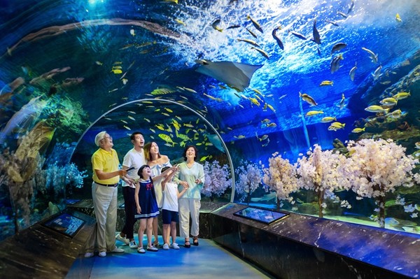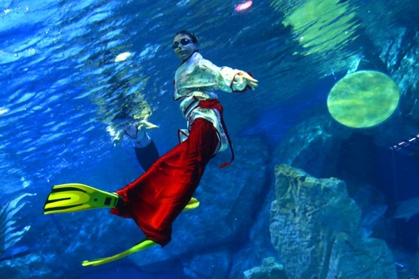 长达12米的扎染文化墙已经就位 海上奇幻月 一年一次的新耍法 据了解,为了契合中秋节日氛围,长达12米的巨幅传统扎染布“7萌追月”将落位于公园的北极熊广场,游客除了可以观摩这个巨幅传统扎染作品外,还能自己动手体验扎染,做一张手绢带回家。同时,为了凸显“海上奇幻月”的活动主题,公园鲨鱼馆里的水域中将出现一轮特别的水中月,此“明月”的周围不是繁星银河,而是鳐鱼、护士鲨、黑鳍鲨等海洋鱼群,惊险又不失浪漫感,而更为惊艳的是每天还有外籍演员身着汉服在水中为上演传统的“嫦娥奔月秀”,与你隔屏互动,送上限量版的视觉盛宴。