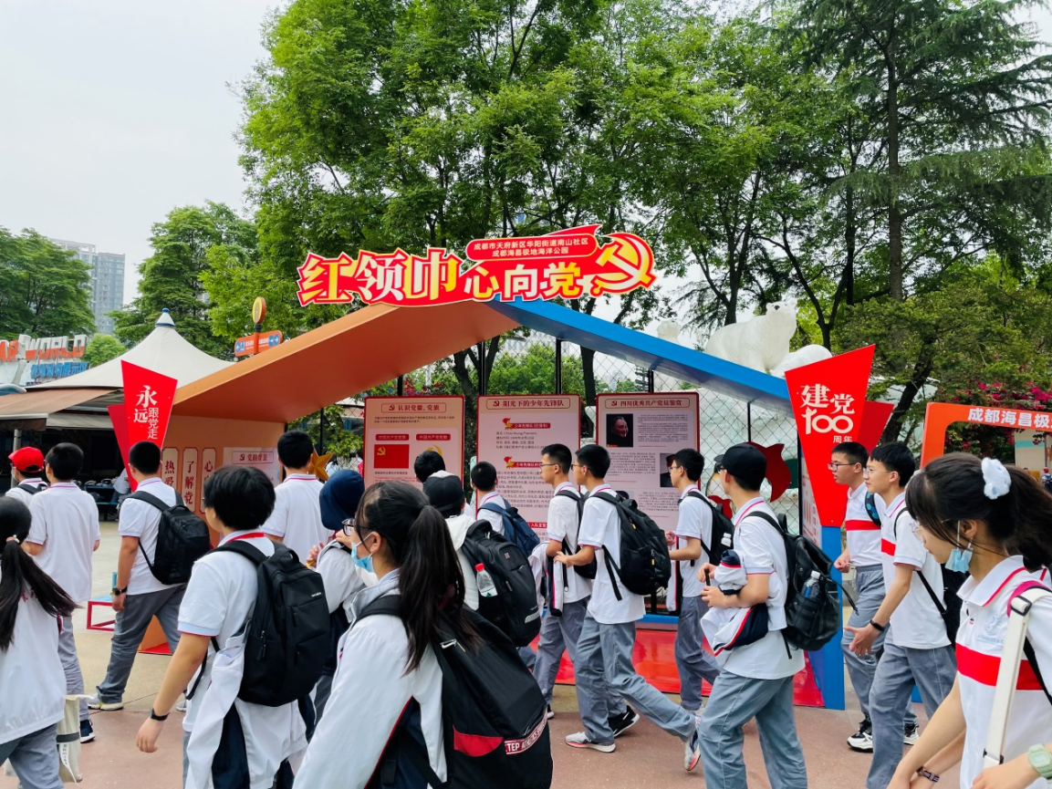为迎接中国共产党建党一百周年,回顾中国共产党艰苦卓绝的奋斗历程,传承红色文化,弘扬民族精神。5月,来自成都郊县简阳、都江堰、彭州的4.5万余中小学生来到成都海昌极地海洋公园,参与了以“红领巾心向党”为主题的红色研学实践活动。活动期间,公园设置了“党史回顾展”、“一堂特别的党课”等活动,让学生们在游玩中一起回顾了党的光辉历程,接受红色教育洗礼。