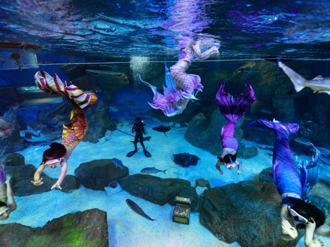儿童水下美人鱼秀将在公园的鲨鱼池内上演,有别于以往的美人鱼表演,最小仅6岁的小美人鱼们需要克服水下的高压和浮力等环境对体力的影响,也要克服对鲨鱼的恐惧心里,在鲨鱼池中与各类鲨鱼共舞,吐泡泡、前空翻、后空翻……届时将为游客们呈现一场精彩、刺激的演出。