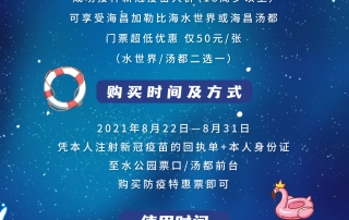 重庆海昌加勒比海积极响应国家号召,大力支持疫情防控工作,对近期接种疫苗人群推出3折起游玩惠民活动,用实际行动为国家鼓励宣传疫苗接种——凡2021年8月21日起,于重庆市南岸区南山街道社区接种点或南山街道移动接种车成功接种新冠疫苗人群(18周岁以上),可享受重庆海昌加勒比海水世界或重庆南山海昌汤都门票超低优惠,仅50元/张(水世界/汤都二选一)。 购买时间及方式:2021年8月22日—8月31日,凭本人注射新冠疫苗的回执单+本人身份证至水公园票口/汤都前台购买防疫特惠票后可立即 [...]