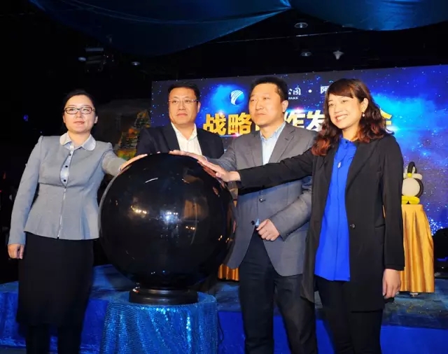 (左起:天津海昌极地海洋公园总经理肖肃女女士 、海昌海洋公园控股有限公司行政总裁王旭光先生、阿里旅行总裁李少华先生、阿里旅行副总裁金奕女士共同启动全国首家阿里旅行O2O体验店)