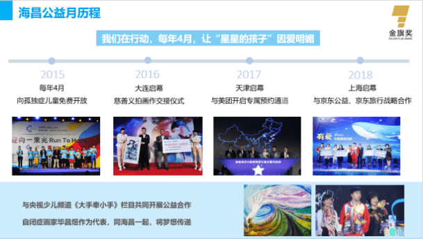 “关注孤独症儿童公益主题月”自2015年起,已连续成功举办4年。2019年,海昌海洋公园跨界合作全面升级打造公益品牌IP,联合公益伙伴壹基金、美团公益、美团门票共同发起“海昌海洋公园公益月暨关爱孤独症儿童及家庭计划主题活动”,携手10大孤独症公益机构共同实施对孤独症儿童的关爱行动,联合近20家异业品牌共同进行公益月活动宣传,以及央视著名主持人鞠萍、30余位影视明星、300余名社会各界知名人士共同“为爱发声”,以此扩大品牌声量触达更多受众,收获关注人数突破上亿人次。