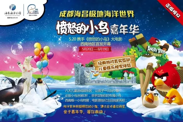 “愤怒的小鸟”嘉年华活动将于5月20日-6月20日在成都海昌极地海洋公园举办,是全国首家获得芬兰Rovio公司正版授权的主题公园,将100%原版呈现欢乐盛宴。整个活动占地近2000平方米,所包含的娱乐项目有欢乐气模乐园、模型合影、游戏竞技、DIY互动、表演娱乐及休闲售卖区等。在这里游客可以走出屏幕,真实体验与“小鸟”一起攻打“小猪城堡”、勇闯“猪猪迷宫”、观看人偶表演等,让游客能够沉浸在“愤怒的小鸟”这一全球知名主题IP的快乐中。