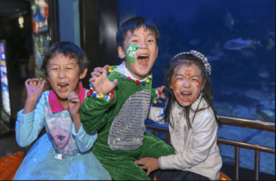 天津海昌在万圣节当天推出99元“奇趣海洋疯抢万圣趴”,带着精致面部彩绘、身穿万圣服装、手拎装满糖果的南瓜手提袋、看vip专场表演,夜间探索幽静神秘的海洋公园。游客可以在园内领取答题卡,完成科普问答,兑换万圣糖果,Cos大比拼,朋友圈打卡集赞,开启终极大奖,届时更有万圣疯抢趴限时开启。