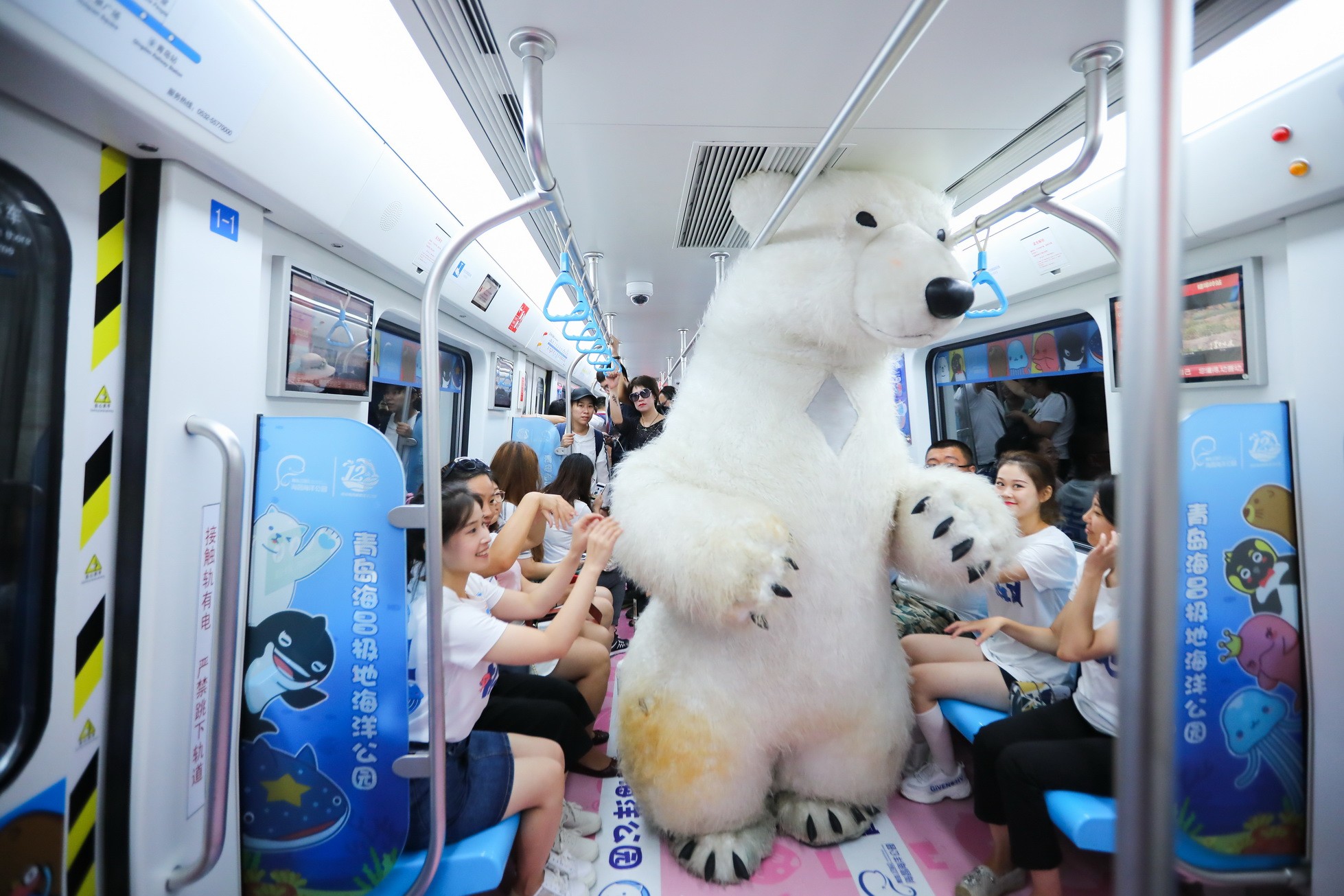 8月9日,网红地铁“极地号”由青岛北站缓缓驶出,车门打开,人潮涌入,乘客立刻被地铁内卡通的Q版设计所吸引,掏出手机,纷纷与萌宠们来一次“亲密邂逅”。此时,洗脑减肥曲《卡路里》忽而响起,一只“巨型北极熊”出现于车厢中,随行左右的还有4名小姐姐,跟随着欢快的节奏、魔性的旋律,车厢内气氛立刻达到顶点,这份意想不到的情境,着实给了乘客们不小的惊喜。