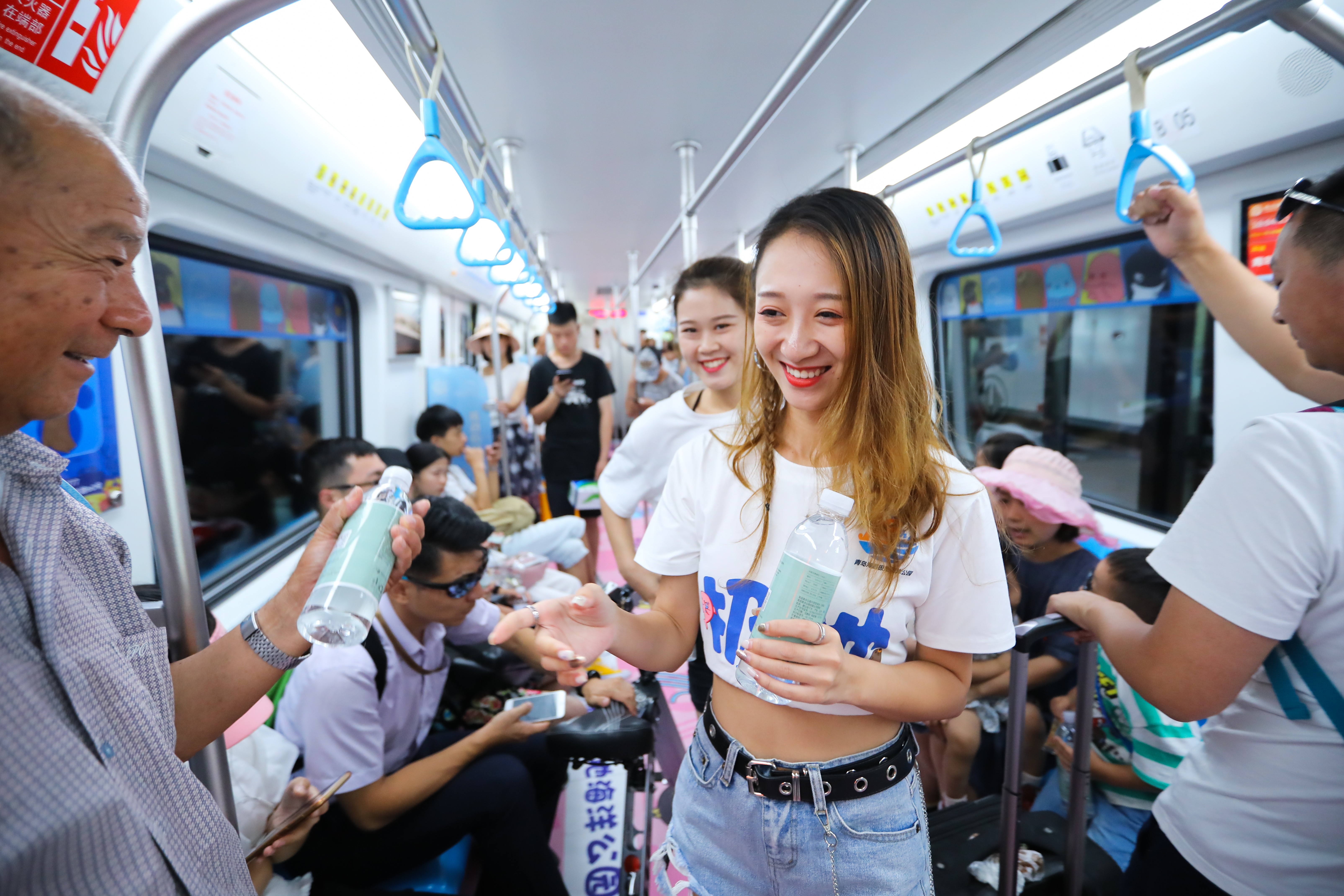 原来,这是由青岛海昌极地海洋公园在酷暑炎夏,特别策划的“极地夏日送清凉”活动,除了以上丰富的游戏互动,现场中,“北极熊”还与小姐姐们为乘客们及周边站口枢纽派发送上夏日一份份暖暖的爱心——极地定制饮用水,让乘客们在盛夏感受清凉、消解暑意。