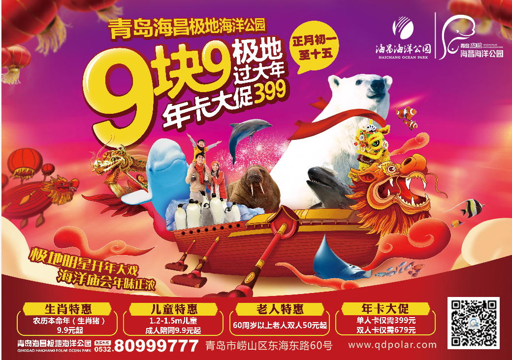 要说今年谁最红? 是靠硬核蒸汽朋克风再次走红的 “小猪佩奇” 还是迪士尼可爱到犯规的 “小猪皮杰” 要论 真·猪年网红 绝对是我啊 等了好久终于等到今天, 今年春节二师兄终于可以C位出道, 带你去青岛海昌极地海洋公园 潇洒走一遭! “六”福放价惠出游 精致猪猪过大年 一、本命福|猪属相游客,9.9元耍极地 本命年农历属猪的市民游客, 持本人身份证购买极地海洋馆门票, 可享9.9元优惠票价。在以上优惠基础上加购: 欢乐剧场/深海奇幻/5D动感体验馆任一小馆, 每人仅需另付10元。