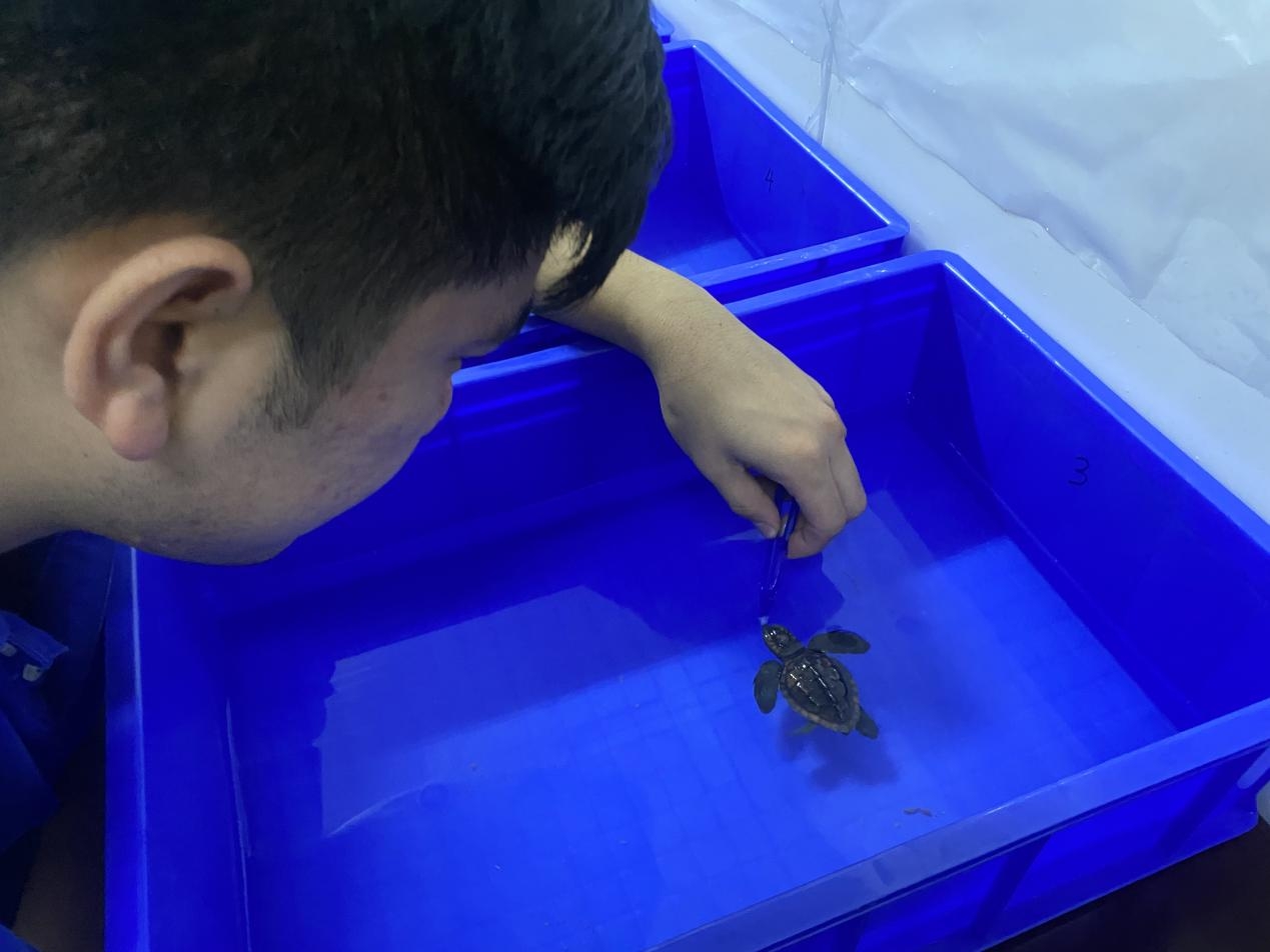 【保育员哥哥在耐心的给小蠵龟补充营养】
