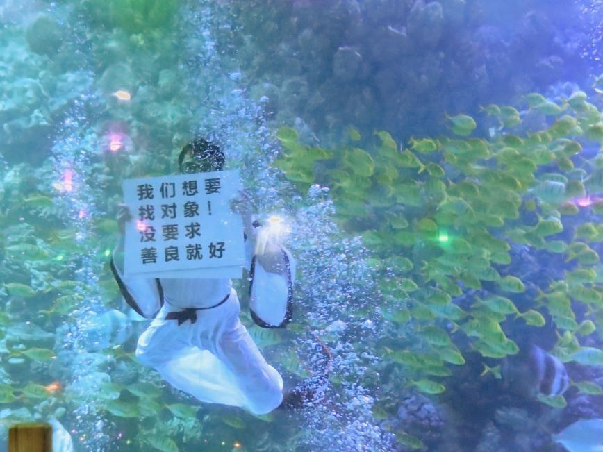 水下征婚引来了众多游客驻足观看,其中采访者刘先生表示:“之前看到过很多形式的征婚,身着汉服的“男美人鱼”潜入水底征婚,还是第一次看到,希望两位保育员可以早日找到真爱”。