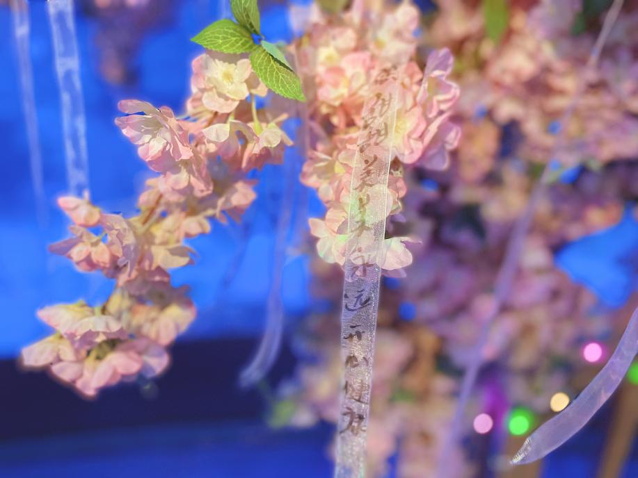水下征婚结束后,洄游池展缸前的“鹊桥”又上演了一出牛郎、织女情景剧,剧中两情相悦、分离之痛、相思之苦、重逢之喜演绎得淋漓尽致。演出结束后“牛郎织女”表演者向现场游客派发七夕香包及许愿丝带,邀请现场的游客将满满的祝福写到丝带上,并挂至鹊桥一侧的桃花树上。桃花树挂满“我们要一直在一起”、“一生一世只爱一个人”、“不离不弃白首不分离”等等意义深重的祝福。