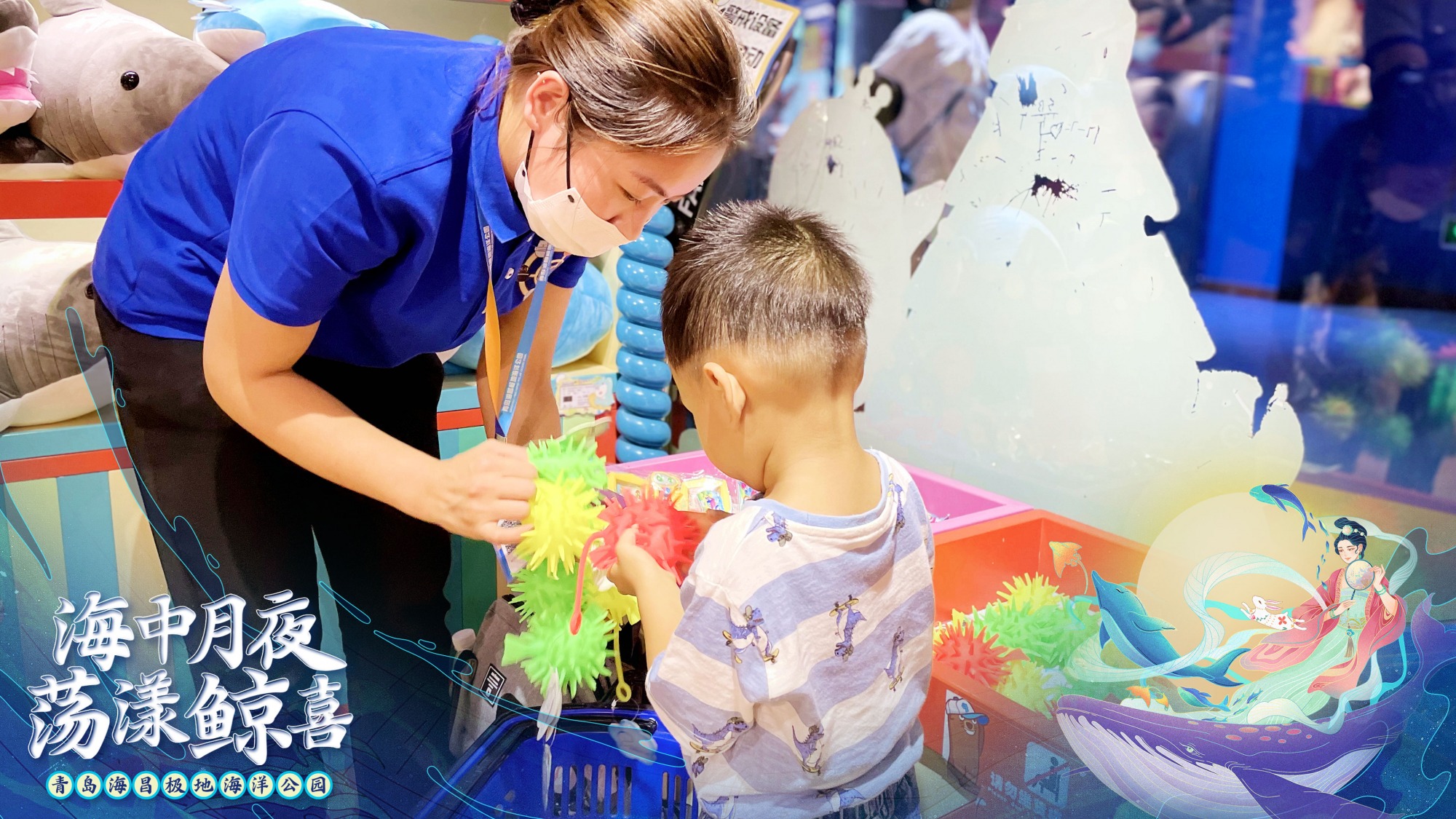 衍生消费部的工作人员正在帮助小游客选择