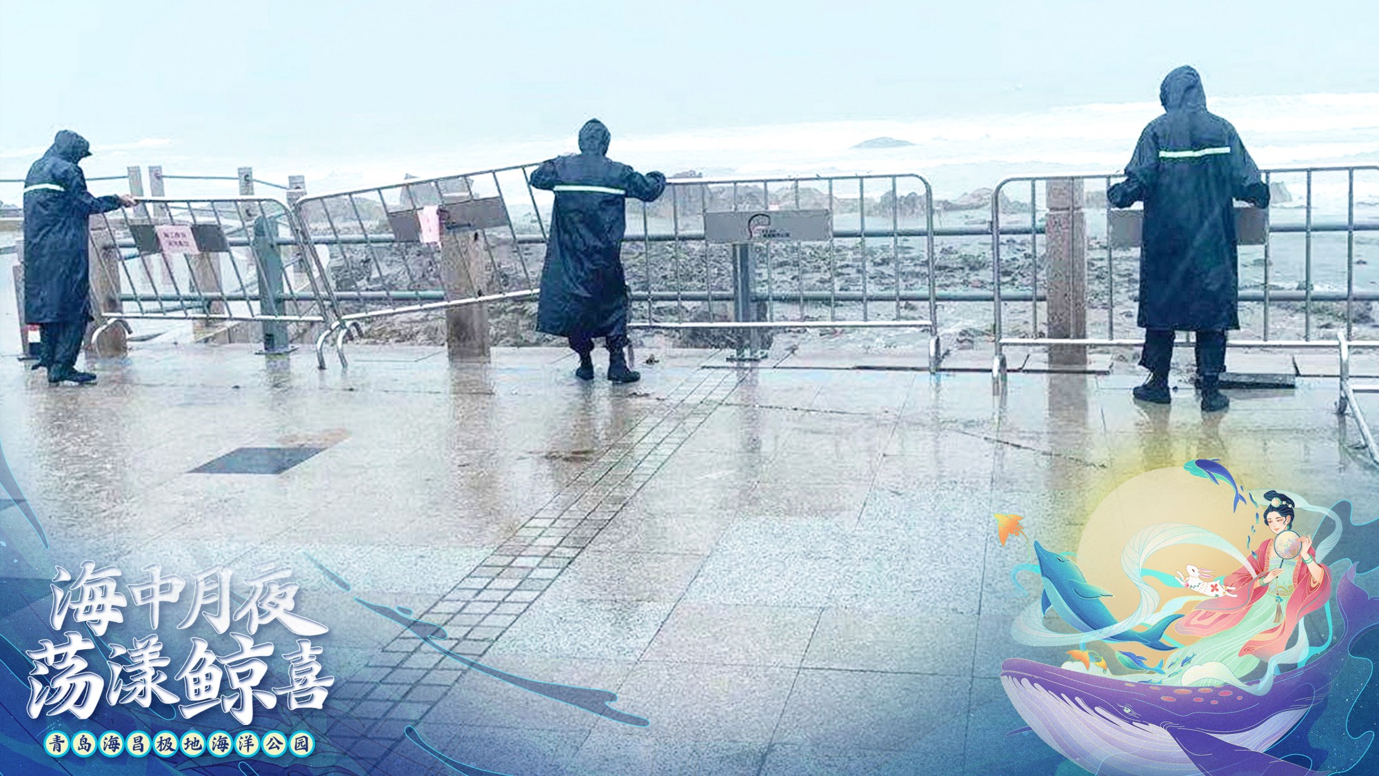 商业物业部的工作人员站在风雨中保障馆外的游客安全