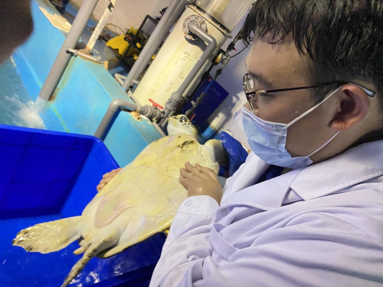 【青岛海昌极地海洋公园的工作人员对绿海龟外观检查】