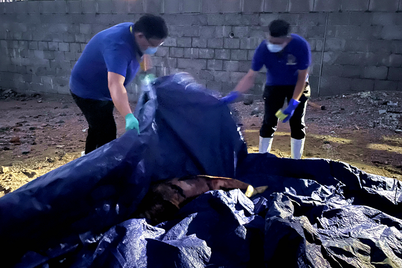 图注:青岛海昌极地海洋公园动物救助员正在收殓动物尸体