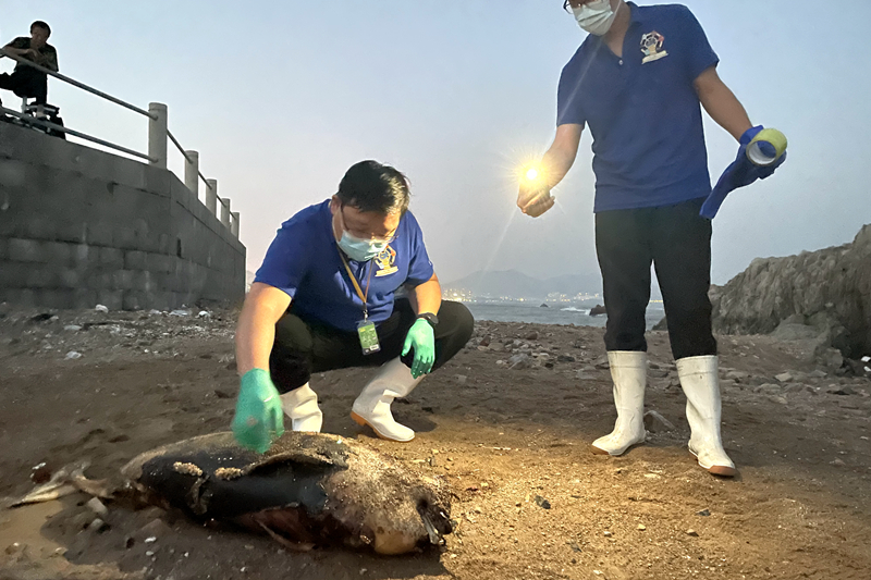 图注:青岛海昌极地海洋公园动物救助员正在检查动物尸体