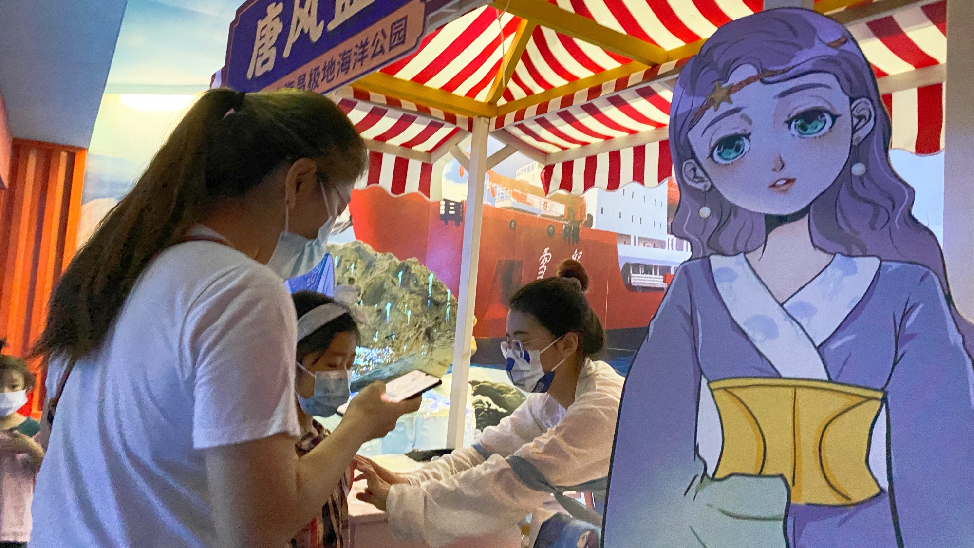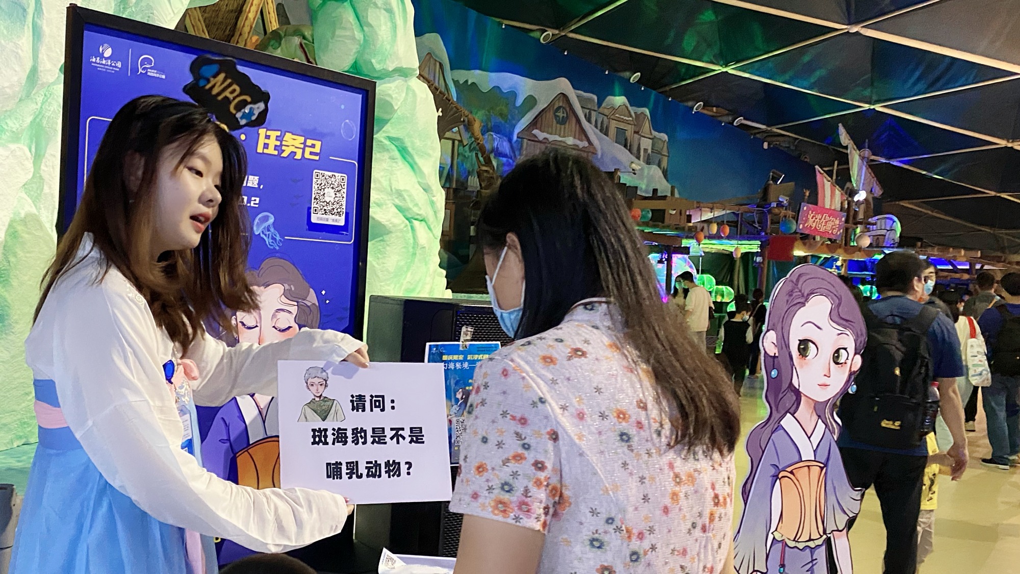 不过最令游客惊喜的,当属公园在国庆期间推出的自有IP改编剧本杀——《幻海秘境•海珑珀》。剧本杀的参与方式、获奖方法都十分简单,游客只需进园寻找手举题卡的唐装小姐姐,正确回答问题并一路“过关斩将”,就能集齐所有印章,兑换公园为游客准备的国庆礼物。据工作人员介绍,每一关的问题均经过认真筛选,问题和答案不但结合了自有IP,且做到了出人意料、妙趣横生,更能加深游客对极地海洋动物的了解,并引发游客对保护极地海洋环境的思考。此外,小姐姐们身穿唐装也是为了令游客更快沉浸感受《幻海秘境•海珑珀》的精彩剧情,让游客穿越时光,跟随剧中主角“五月”,打破次元壁,共同踏上幻海秘境的探奇之旅。日后,公园还将不断打破产业边界,继续探索“文旅+剧本杀”的创新模式,让游客的极地海洋之旅充满惊喜。