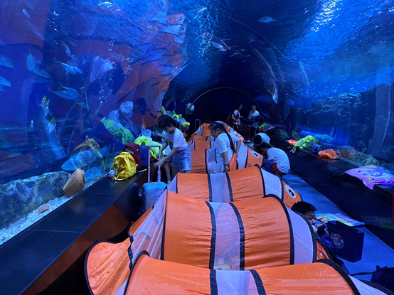 决赛结束后,小朋友还体验到“海底夜宿”特色项目,在湛蓝的海底隧道中,小朋友们和家长共同搭建小丑鱼帐篷,享受其乐融融的亲子家庭时光,在各种海洋动物的簇拥下,感受海底世界的美丽,享受静谧、美好而独特的夜晚,为本次小小梦想家画下圆满的句号。