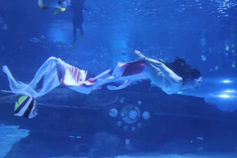天津海昌“首届水下时装秀”中,身材曼妙的模特儿们化身一条条楚楚动人的“美人鱼”,不仅身着如大海般飘渺的轻纱薄缕、性感迷人的比基尼,还有优雅妩媚的轻盈长裙、风韵优美的旗袍等多款主题的时装。配合精心布置的光影效果、富有海洋特色的水底生物、美轮美奂的海底氛围,各式各样的时装显得靓丽多彩,形成一道极具特色的水下风景线。