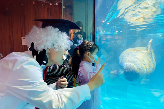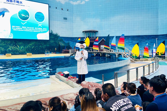 在每周二下午,天津海昌原创科普IP“海博士”现身场馆,在企鹅、白鲸、北极狼、海狮、海豚等各个点位现场教学,在与游客的互动中,回答小朋友提出的问题,利用赠送小礼物的方式,活跃现场气氛,让小朋友在游览的过程中即可学习到丰富的海洋文化知识。而在鲸豚剧场,还特别增设科普大讲堂活动,结合现场环境,并针对小朋友关心的“海豚为什么会跃出水面”、“海豚喜不喜欢睡觉”等问题,进行海豚科普课讲解,利用天津海昌特有的资源优势,更直观的进行互动体验,充分体验到沉浸式科普的快乐。