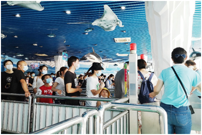 武汉海昌极地海洋公园,是武汉旅游地标,华中区域海洋文化主题公园的象征。作为颜值与内容并存的景区,一直以来也深受大家的喜爱。穿越南北极,齐聚海陆空。各类夏日戏水清凉活动也在不停放送。欢迎全国游客前来游玩。武汉海昌极地海洋公园,是武汉旅游地标,华中区域海洋文化主题公园的象征。作为颜值与内容并存的景区,一直以来也深受大家的喜爱。穿越南北极,齐聚海陆空。各类夏日戏水清凉活动也在不停放送。欢迎全国游客前来游玩。2020年8月11日,湖北省“与爱同行,惠游湖北”活动的第四天,早上8:30,记者来到武汉海昌极地海洋公园广场,广场内已架起了遮阳棚,游客正井然有序的排队入园,队伍的两旁列着广告牌,提示今日预约已满,现场无预约,未预约的游客请勿排队,择日预约成功后再来。